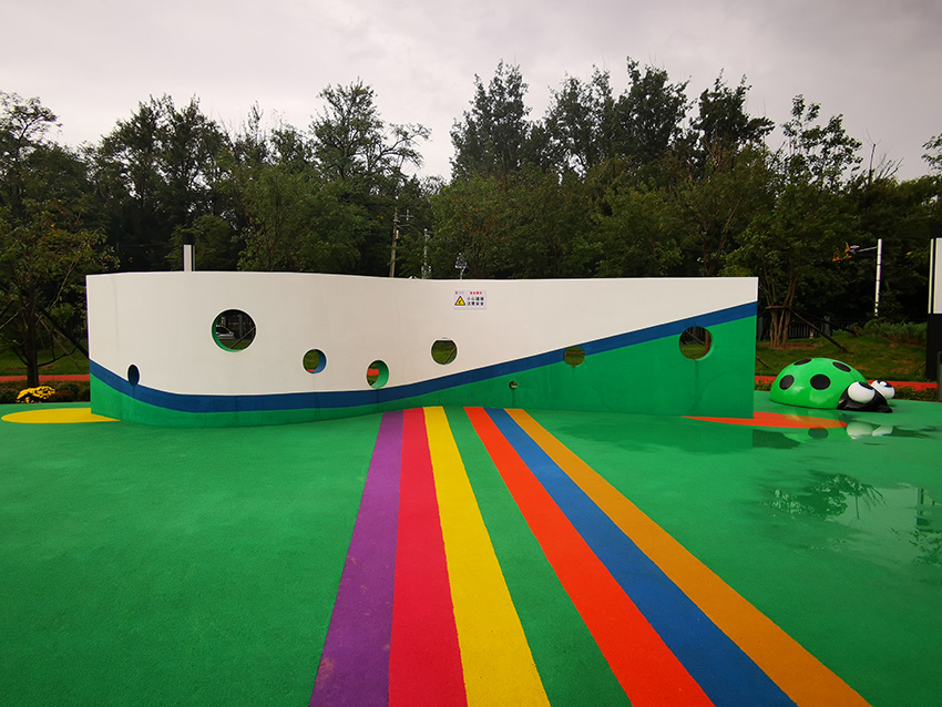 七彩橡膠廣場與景觀墻組合在一起,是孩子們玩耍的地方。