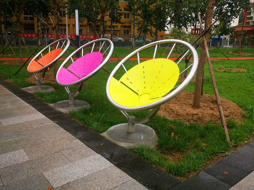 造型別致的椅子供游人們休息,鮮艷的色彩,就像是盛開的花朵。